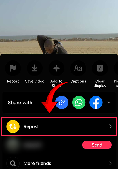 If your app version includes a “Repost” button directly below the “Share” button, simply tap it to instantly share the video to your feed.